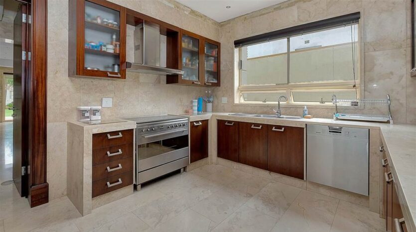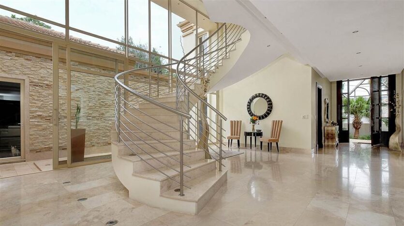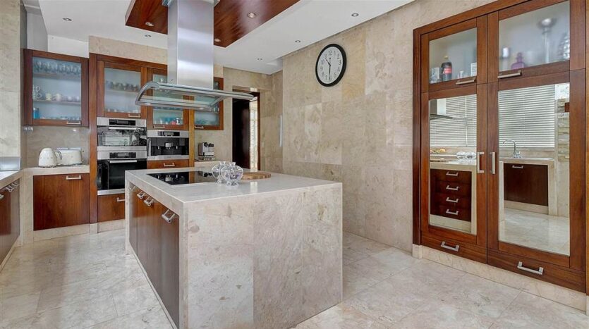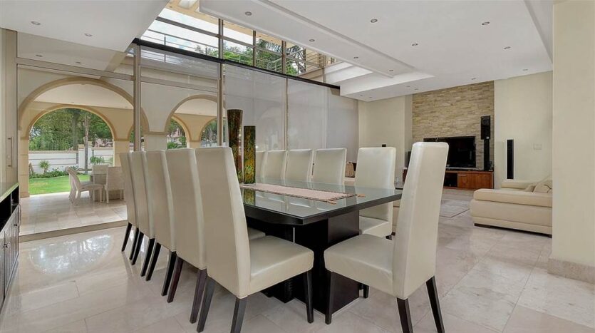 A double volume entrance hall to open plan living areas which leads to outdoor patio and manicured garden. Guest cloakroom. Chefs delight which consists of 3 kitchens with Miele appliances, integrated fridge and freezer, centre island also dine-in area. Scullery and laundry.